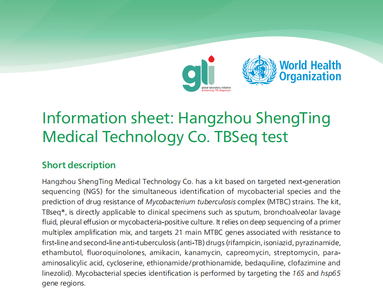 近日,世界衛(wèi)生組織(World Health Organization)和促進(jìn)結(jié)核病診斷的全球?qū)嶒?yàn)室倡議(global laboratory Initiative advancing TB diagnosis)聯(lián)合介紹了圣庭醫(yī)療開發(fā)的結(jié)核病診斷與耐藥診斷的革命性產(chǎn)品TBseq®。